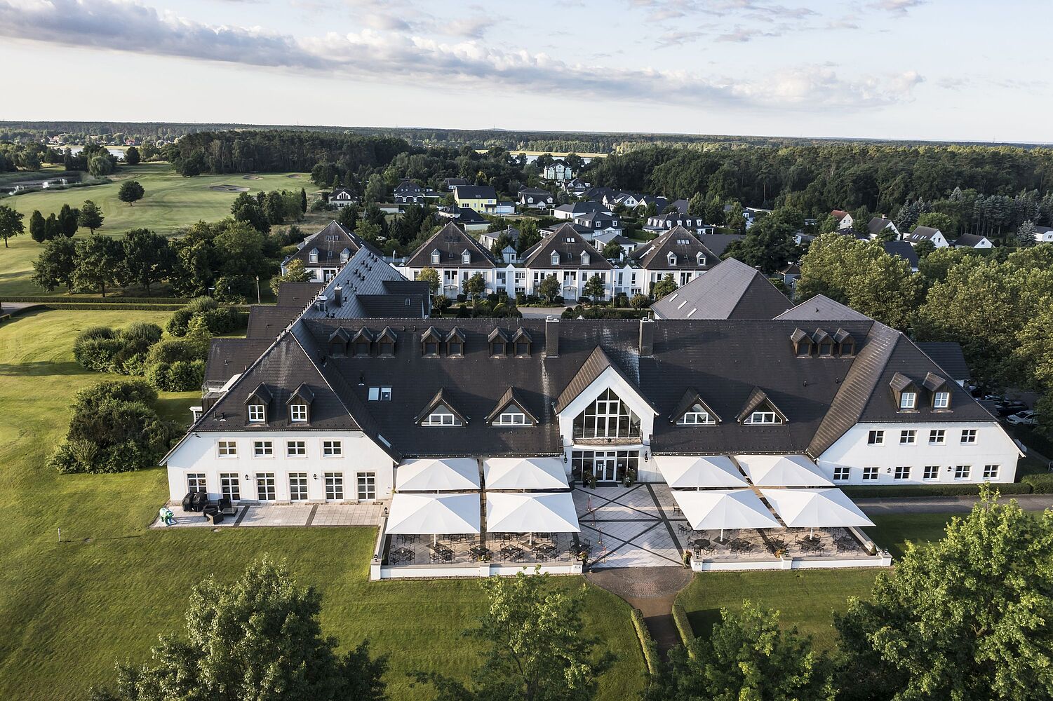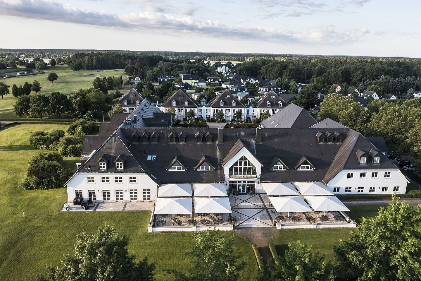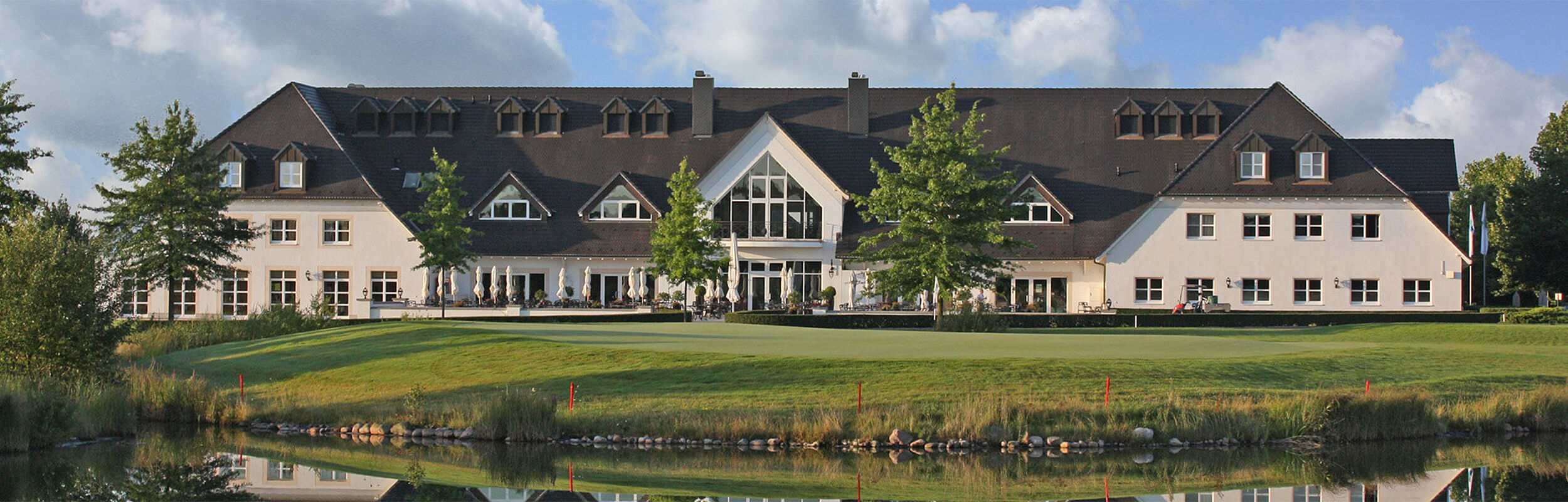 Das einstöckige, elegante Clubhaus im Country-Stil ist im Inneren in hellen Farben gestaltet. Weiche Teppiche, marmorierte Wände und üppig drapierte Fenster strahlen Behaglichkeit aus.
