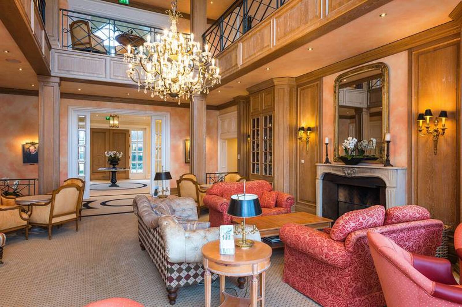 Von hier aus blickt man auf das 18. Grün des Nordplatzes und die Driving-Range. Im ersten Stock befinden sich ein Bridge- und Fernsehraum, ein Fitnessraum, eine Indoor-Putting-Anlage und ein Billardzimmer.