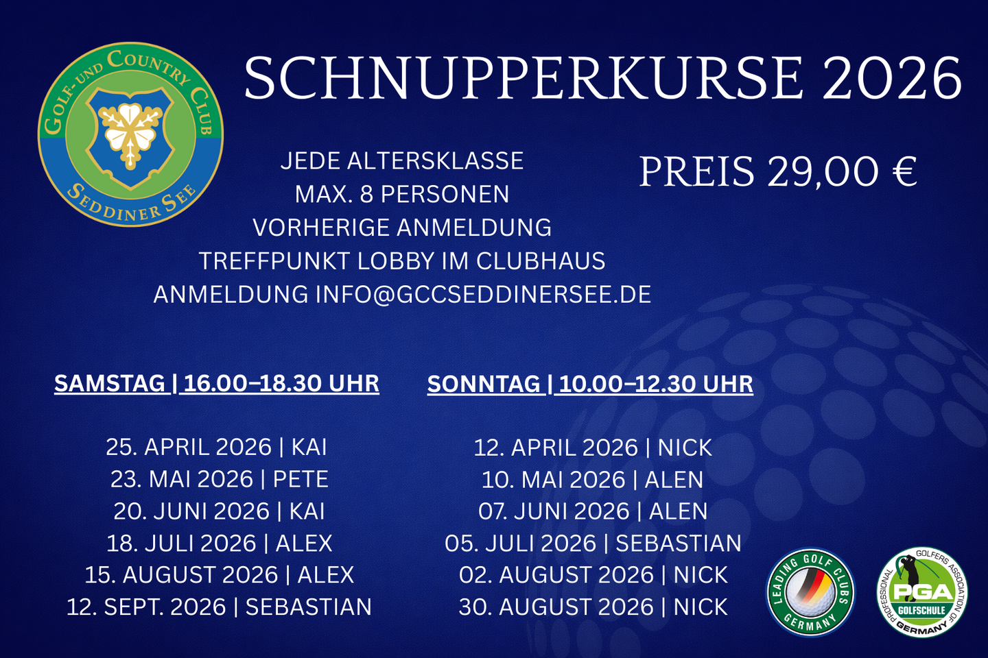 Melden Sie sich jetzt für Ihren 2-stündigen Schnupperkurs gern unter https://www.gccseddinersee.de/turniere/eventkalender-anmeldung an.