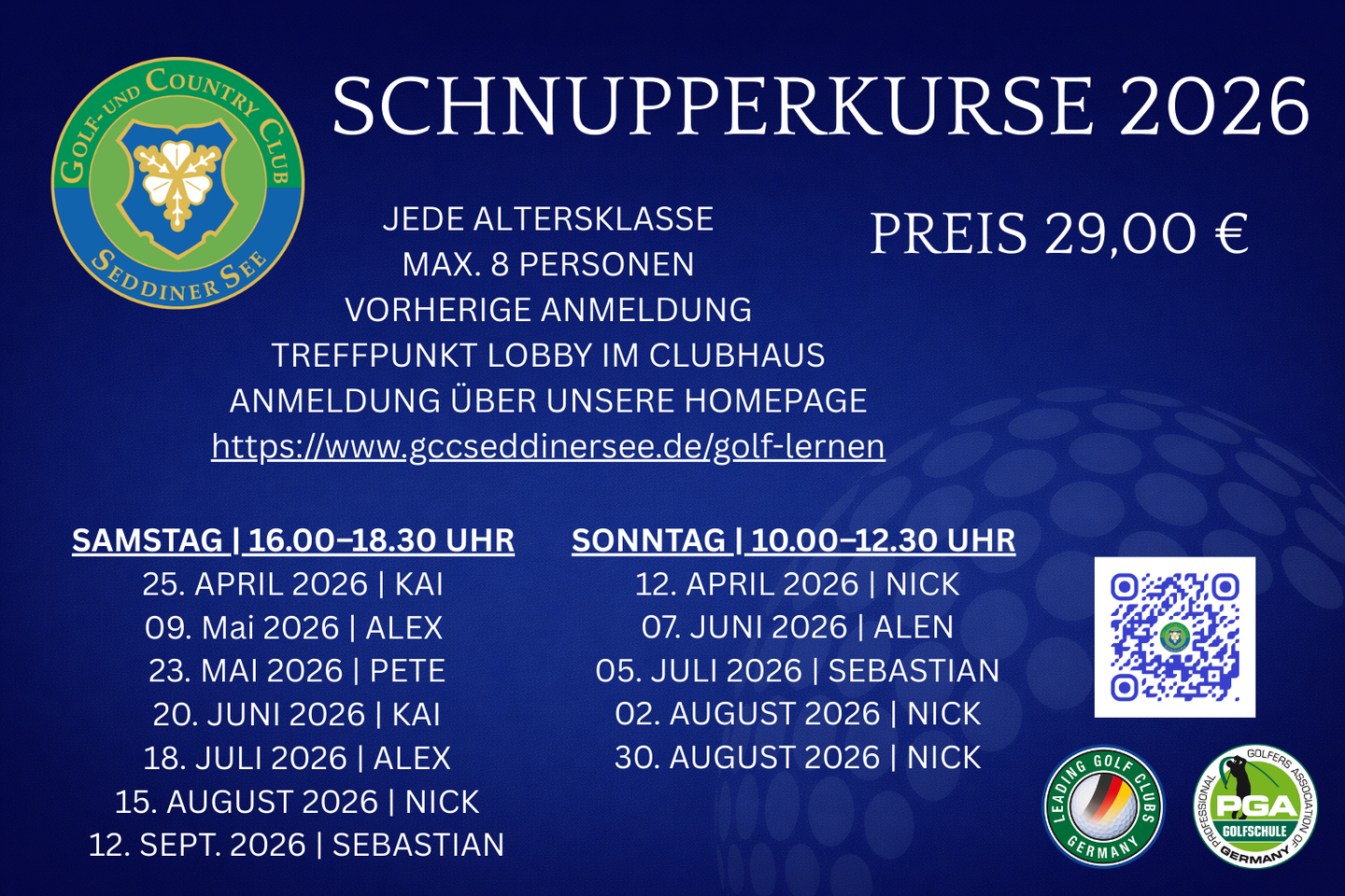 Wir geben Ihnen die Möglichkeit sich 12 Monate lang mit dem Golfsport vertraut zu machen. Nutzen Sie unser Schnupper-Golf Paket für € 590,00 und machen Sie Ihre ersten persönlichen Erfahrungen mit dem Golfsport in einer ungezwungenen Atmosphäre und unter professioneller Betreuung durch unsere PGA Golflehrer.