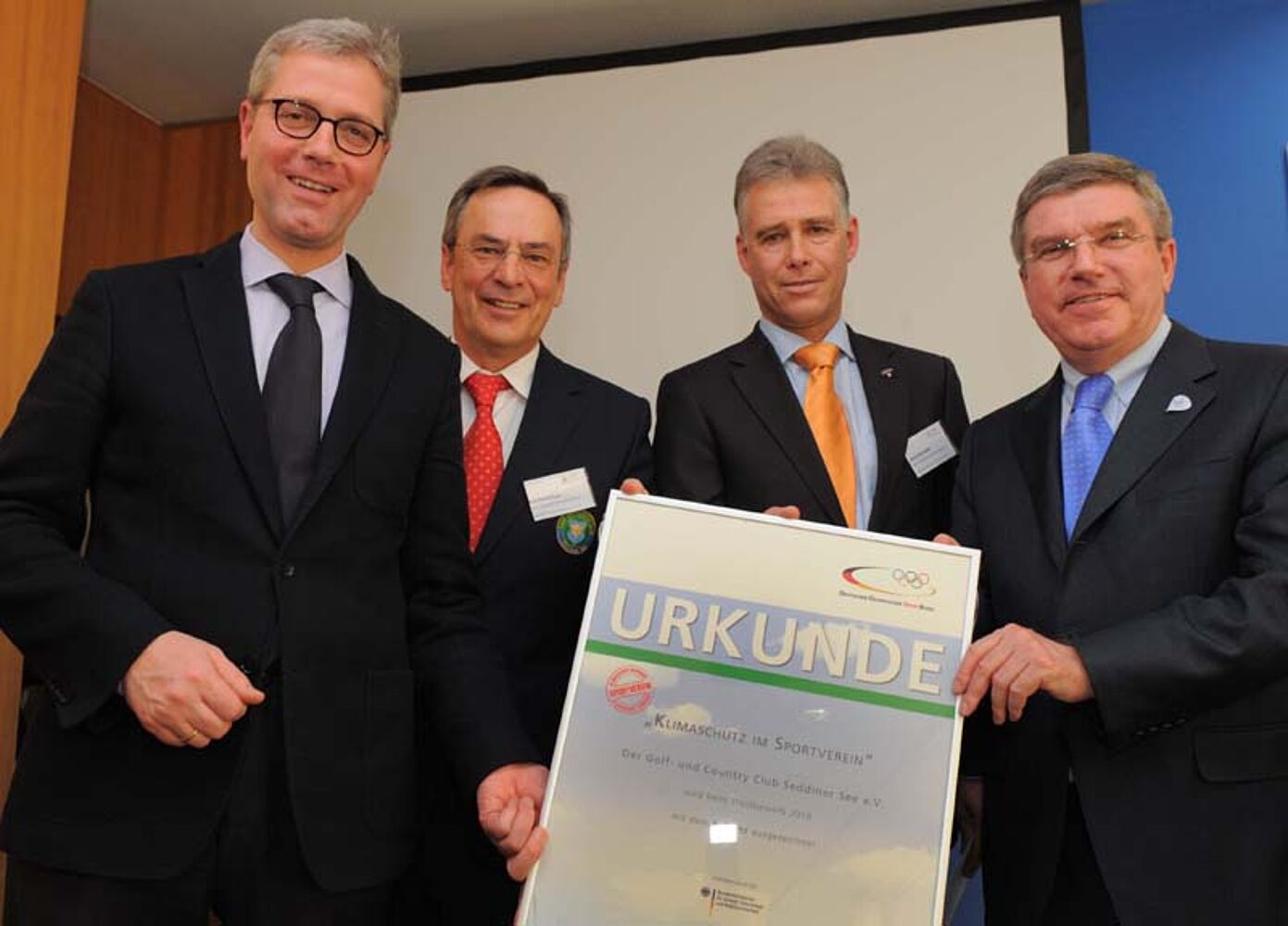 Wiesbaden, 10.02.2011. Der Golf- und Country Club Seddiner See steht nicht nur für zwei anspruchsvolle und herausfordernde Golfplätze. Der Platzrekord auf dem Südkurs hält kein geringerer als Martin Kaymer. Nein, Seddiner See macht auch durch sein konsequentes und nachhaltiges Umweltmanagement auf sich aufmerksam. Das hat sich nun auch auf höchster Ebene herumgesprochen. Der Club wurde am 09.02.2011 in Berlin vom Präsidenten des Deutschen Olympischen Sportbundes (DOSB), Thomas Bach, und von Bundesumweltminister Norbert Röttgen im Rahmen des DOSB-Programms "Klimaschutz im Sportverein" mit einem dritten Platz und 1.000 € Prämie ausgezeichnet.