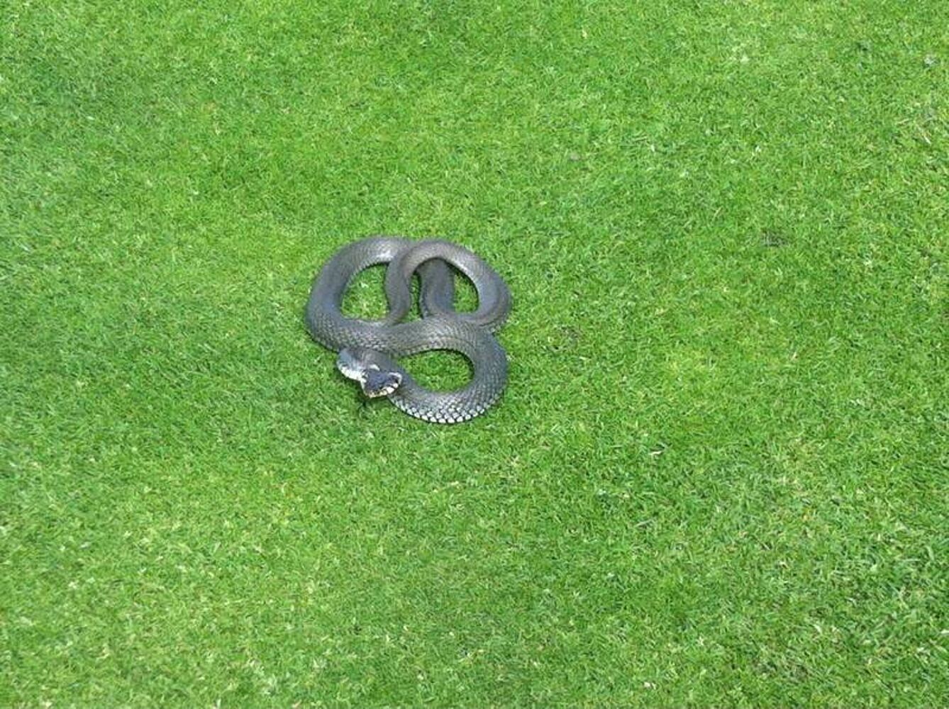 Aber auch auf dem Areal des Golf- und Country Club Seddiner See ist die Ringelnatter zu Hause. Ein besonders prächtiges Exemplar dieser Gattung „erwischte“ unser Clubmitglied Dr. Heinz Wehselau jetzt vor wenigen Tagen auf dem Fairway der Bahn 18 des Südplatzes. Diese Ringelnatter hatte immerhin eine geschätzte Länge von rund 100 cm. Damit dürfte es sich um ein Weibchen gehandelt haben, da männliche Ringelnattern meistens deutlich kleiner sind.